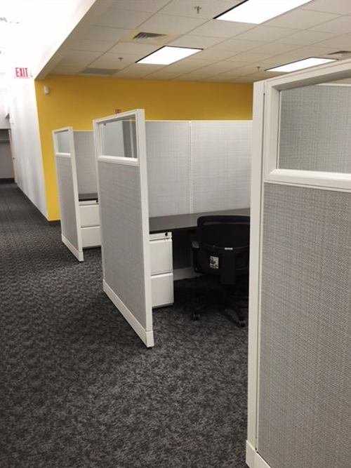 Partisi cubicle yang telah dibuat khusus untuk penyekat di dalam kantor, sehingga privasi antar karyawan terjaga, dilengkapi meja kerja dan perlengkapan kantor lainnya.